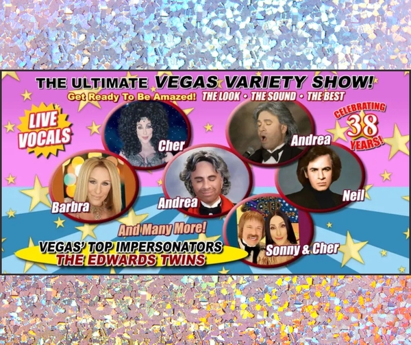 The NBC Today show says “it’s one of the most extraordinary shows we have ever seen.” Sonny & Cher, Billy Joel, Elton John, Neil Diamond, Lionel Richie, Stevie Wonder, Ray Charles, Lady Gaga, Celine Dion, Rod Stewart, Bette Midler, Barbra Streisand, Andrea Bocelli, Frankie Valli, Tom Jones, and many, many more hosted by The Edwards Twins of Las Vegas. USA Today and The Boston Globe raves: “A must-see show”. Each Star sings their number 1 hits as well as your favorite songs… Celebrating over 35 years of being “Extraordinary” – The NBC Today Show. As seen on Netflix’s The Kominsky Method.